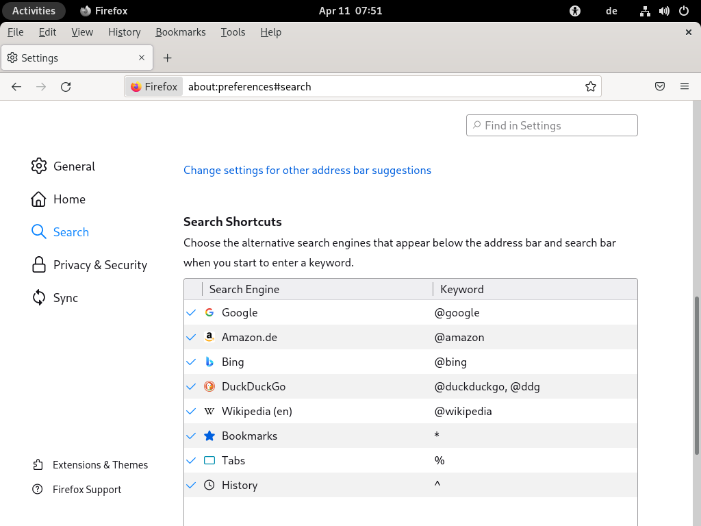 Firefox 允许您定义自己的 关键字:用于特定搜索引擎的 URL 快捷方式的缩写。例如,如果您将 ws 定义为 Wikipedia 搜索的关键字,则您可以键入 ws SEARCHTERM 到地址栏中以搜索 Wikipedia 中的 SEARCHTERM。