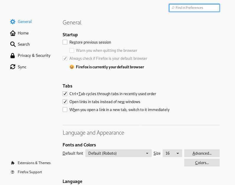 Firefox 提供了广泛的配置选项。这些选项可以通过在菜单栏中选择 › 来访问。对话框中的问号图标可以访问在线帮助,其中详细描述了每个选项。