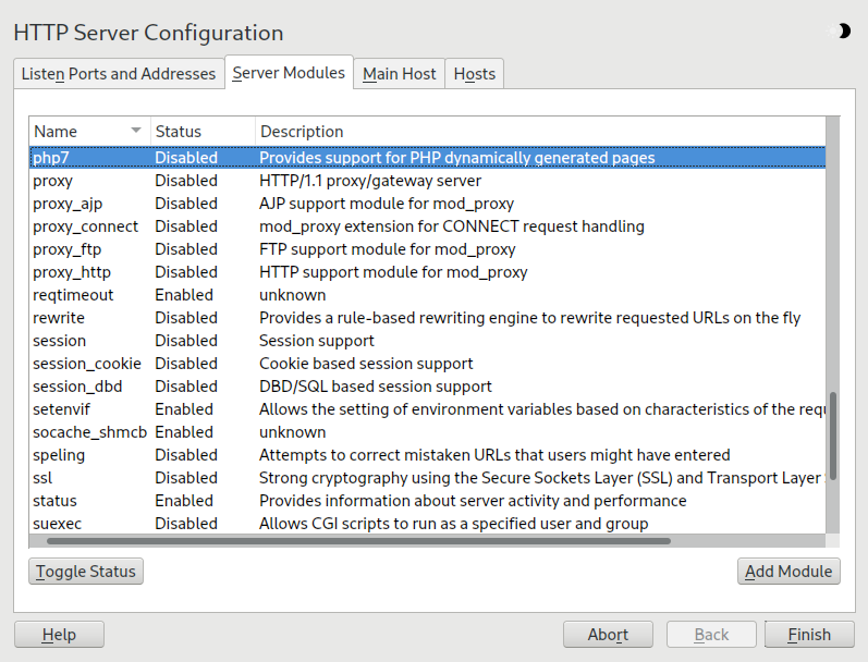 在 openSUSE Leap 上,Apache 默认情况下未安装。要使用标准、预定义的配置进行安装,该配置可以“开箱即用”地运行,请按以下步骤操作