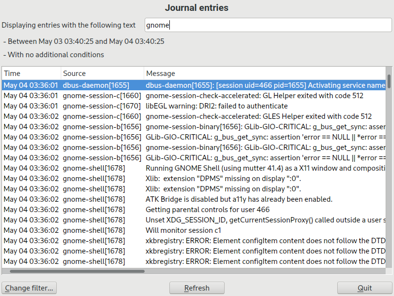 为了轻松过滤 systemd journal(而无需处理 journalctl 语法),您可以使用 YaST journal 模块。 在使用 sudo zypper in yast2-journal 安装它后,从 YaST 中选择 › 启动它。 或者,您可以从命令行启动它,输入 sudo yast2 journal。