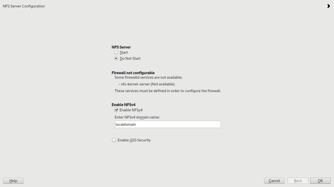 如果您的系统上 firewalld 处于活动状态,请单独为 NFS 配置它(请参阅 第 22.5 节,“在防火墙后运行 NFS 服务器和客户端”)。YaST 尚未完全支持 firewalld,因此请忽略 “防火墙不可配置” 消息并继续。