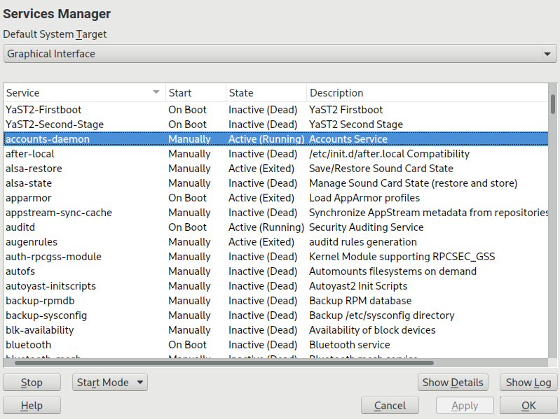上一节中提到的服务管理命令允许您操作当前会话的服务。systemd 还允许您永久启用或禁用服务,以便在请求时自动启动或始终不可用。您可以通过 YaST 或命令行来执行此操作。