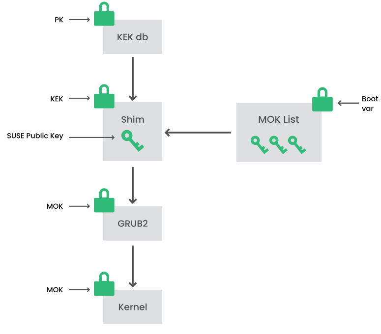 shim 然后继续验证它想要加载的引导加载程序是否受信任。在默认情况下,shim 将使用嵌入在其主体中的独立 SUSE 证书。此外,shim 将允许“注册”其他密钥,覆盖默认的 SUSE 密钥。在以下内容中,我们称它们为“机器所有者密钥”或 MOK 简而言之。