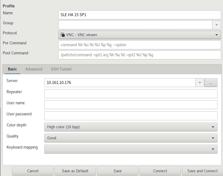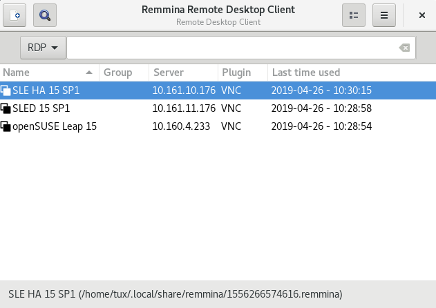 在 Remmina 未运行时,您可以将配置文件重命名为更合理的文件名,例如 sle15.remmina。您甚至可以将配置文件复制到自定义目录,并使用 remmina -c 命令从那里运行它。