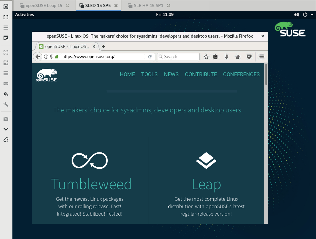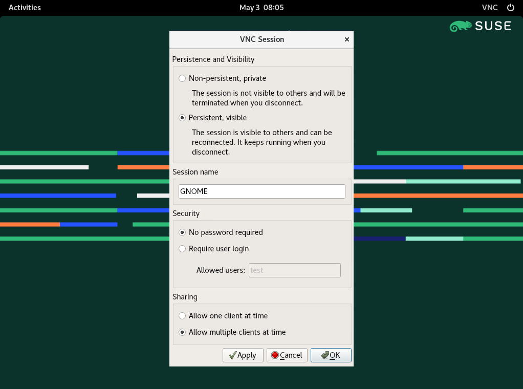 openSUSE Leap 支持两种不同类型的 VNC 会话:一种是““实时”” 会话,只要客户端保持 VNC 连接,就会一直存在,另一种是持久会话,直到显式终止才会““实时””。