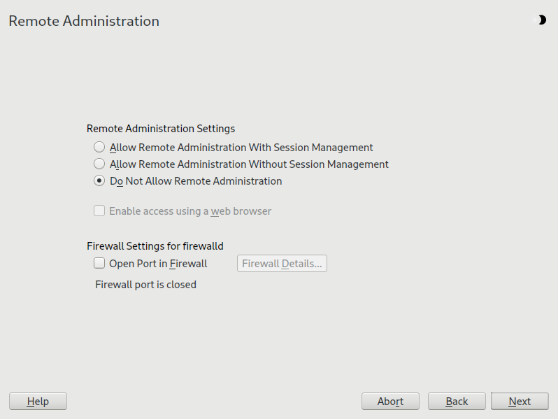 在按照 过程 4.1,“启用一次性 VNC 会话” 描述激活远程管理时,防火墙中将打开端口 5801 和 5901。如果提供 VNC 会话的网络接口受到防火墙的保护,则需要在激活 VNC 会话的附加端口时手动打开相应的端口。有关说明,请参阅 “安全和加固指南”书籍,第 23 章“伪装和防火墙”。