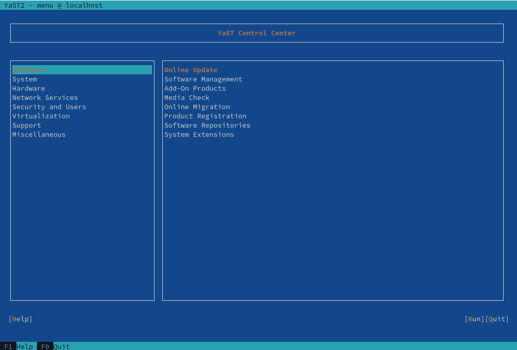 要启动基于 ncurses 的 YaST 版本,请打开终端并运行 sudo yast2 命令。使用 →| 或箭头键在菜单项、字段和按钮等界面元素之间导航。YaST 中的所有菜单项和按钮都可以使用适当的功能键或键盘快捷键访问。例如,您可以按 F9 取消当前操作,而 F10 键可用于接受更改。YaST 的 ncurses 界面中的每个菜单项和按钮在其标签中都有一个高亮的字母。该字母是分配给界面元素键盘快捷键的一部分。例如,字母 Q 在 按钮中被突出显示。这意味着您可以通过按 Alt–Alt+Q 激活该按钮。
