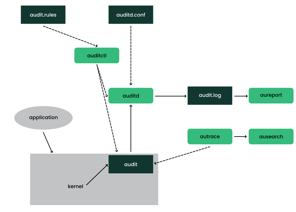 Audit 由几个组件组成,每个组件都为整个框架贡献了关键功能。audit 内核模块拦截系统调用并记录相关事件。 auditd 守护进程将 audit 报告写入磁盘。各种命令行实用程序负责显示、查询和归档 audit 跟踪。