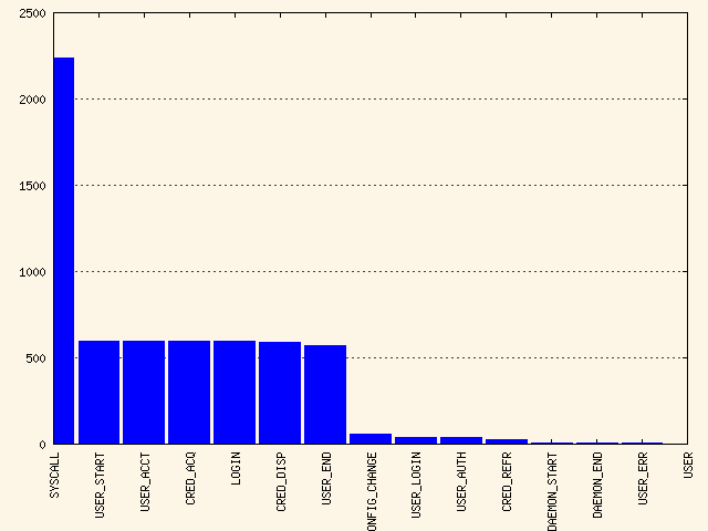 LC_ALL=C aureport -s -i | awk '/^[0-9]/ { print $6" "$4 }' | sort | uniq | mkgraph第二个示例说明了不同类型的事件以及已记录的每种事件的数量。提取此类信息的适当 aureport 命令是 aureport -e