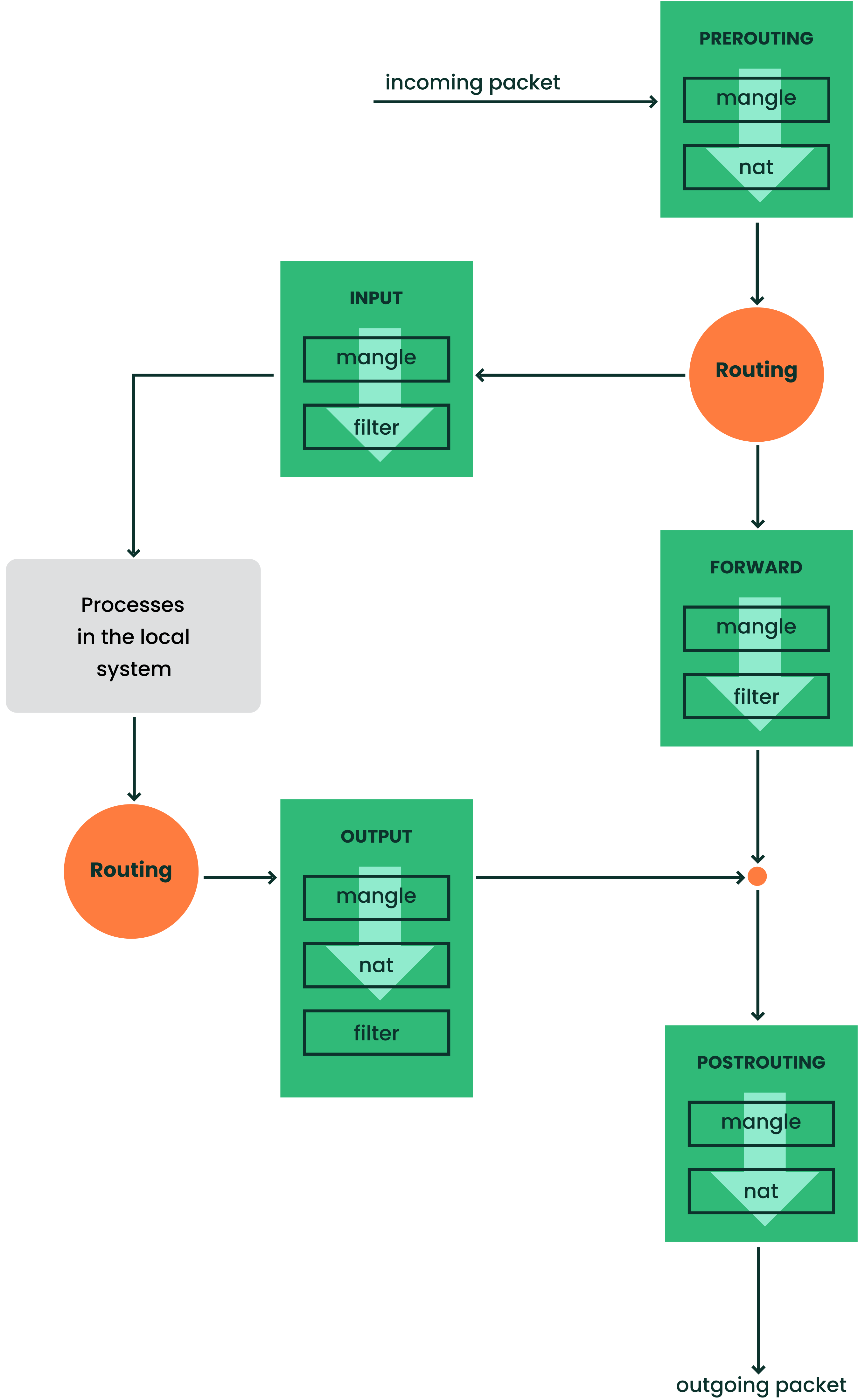 在最简单的情况下,目的地为系统的传入数据包到达 eth0 接口。该数据包首先引用 mangle 表的 PREROUTING 链,然后引用 nat 表的 PREROUTING 链。接下来的步骤,关于数据包的路由,确定数据包的实际目标是系统本身的进程。在通过 mangle 和 filter 表的 INPUT 链后,如果 filter 表的规则允许,数据包最终到达其目标。