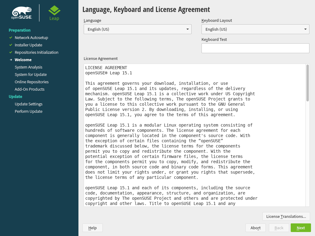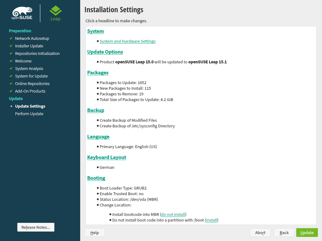 发行说明捆绑在安装程序中,您也可以在线阅读它们,网址为 openSUSE Leap 发行说明。