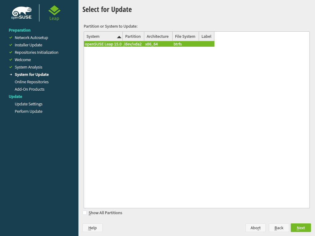YaST 确定是否存在多个根分区。如果只有一个,请继续下一步。如果有多个,请选择正确的分区并使用确认(在第 12.1.1 节,“准备工作”中示例中选择了/dev/sda3)。YaST 读取此分区上的旧fstab以分析和挂载其中列出的文件系统。