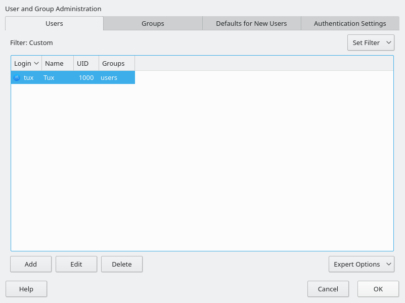 在安装过程中,您可能为系统创建了一个本地用户。使用 YaST 模块 ,您可以添加用户或编辑现有用户。它还允许您配置系统以使用网络服务器对用户进行身份验证。