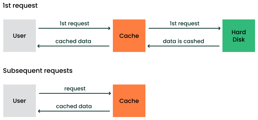 通常,磁盘缓存存储最近和最常用的程序和数据。当用户或程序请求数据时,操作系统首先检查磁盘缓存。如果数据在那里,操作系统会快速将数据传递给程序,而不是从磁盘重新读取数据。