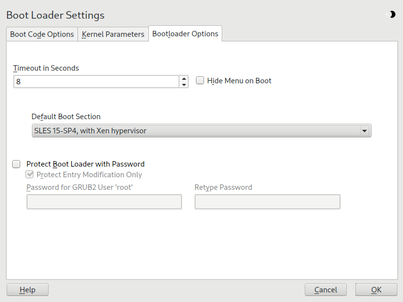 引导加载程序控制虚拟化软件的引导和运行方式。您可以通过 YaST 或直接编辑引导加载程序配置文件来修改引导加载程序属性。